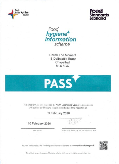 We have been inspected by local council and have been found to meet requirements of Food Standards in relation to the whole producing process and the keeping of records and have been awarded PASS standard of the Food Hygiene Information Scheme.